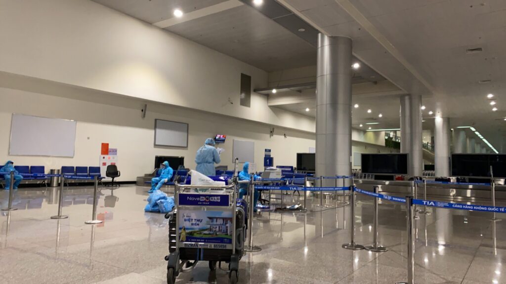 がらんとしたイミグレを、待ちブースを3つ変更しながら紙のビザ発給証明と、航空券、先ほどのQRが印刷された紙をパスポートと一緒に提出し入国です。空港内の全職員が防護服で全身を包まれています。この辺りは出国時の日本と比べて、温度差を感じます。漂っている緊張感が違う気がします。普段のタンソンニャット国際空港の賑わいが嘘のような静けさとピリッとした空気です。