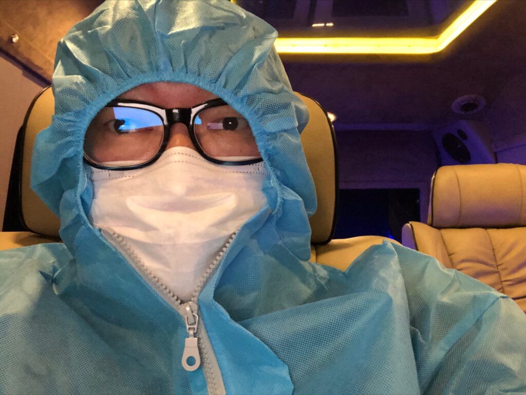 防護服で車に乗り込み、ホテルへ向かいます。ホテルへ到着すると、またも全身&荷物すべてを消毒されます。